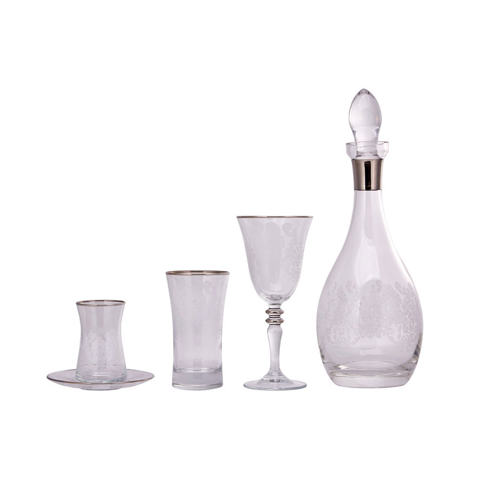 شامل: پارچ (1 عدد)، لیوان پایه بلند (12 عدد)، لیوان معمولی (12 عدد)، استکان چای خوری (12 عدد)، نعلبکی (12 عدد)